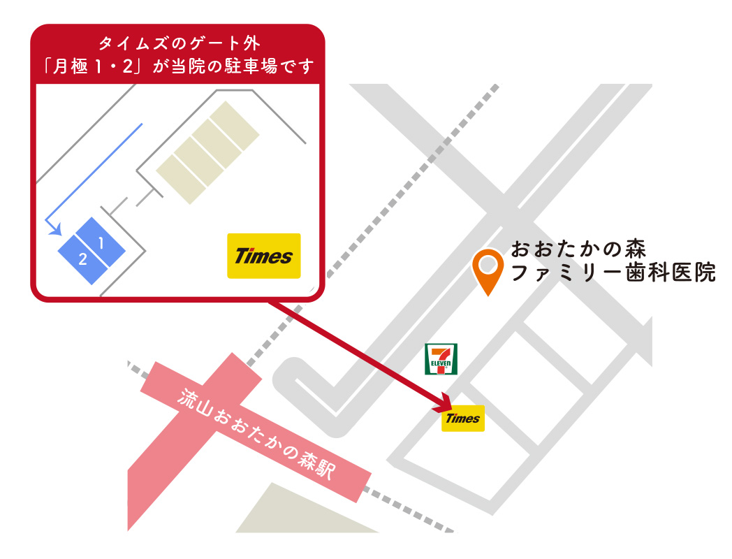 「タイムズ流山おおたかの森第4」のゲート外「月極1」「月極2」が当院の駐車スペースとなります。お車でお越しの際にはこちらをご利用ください。